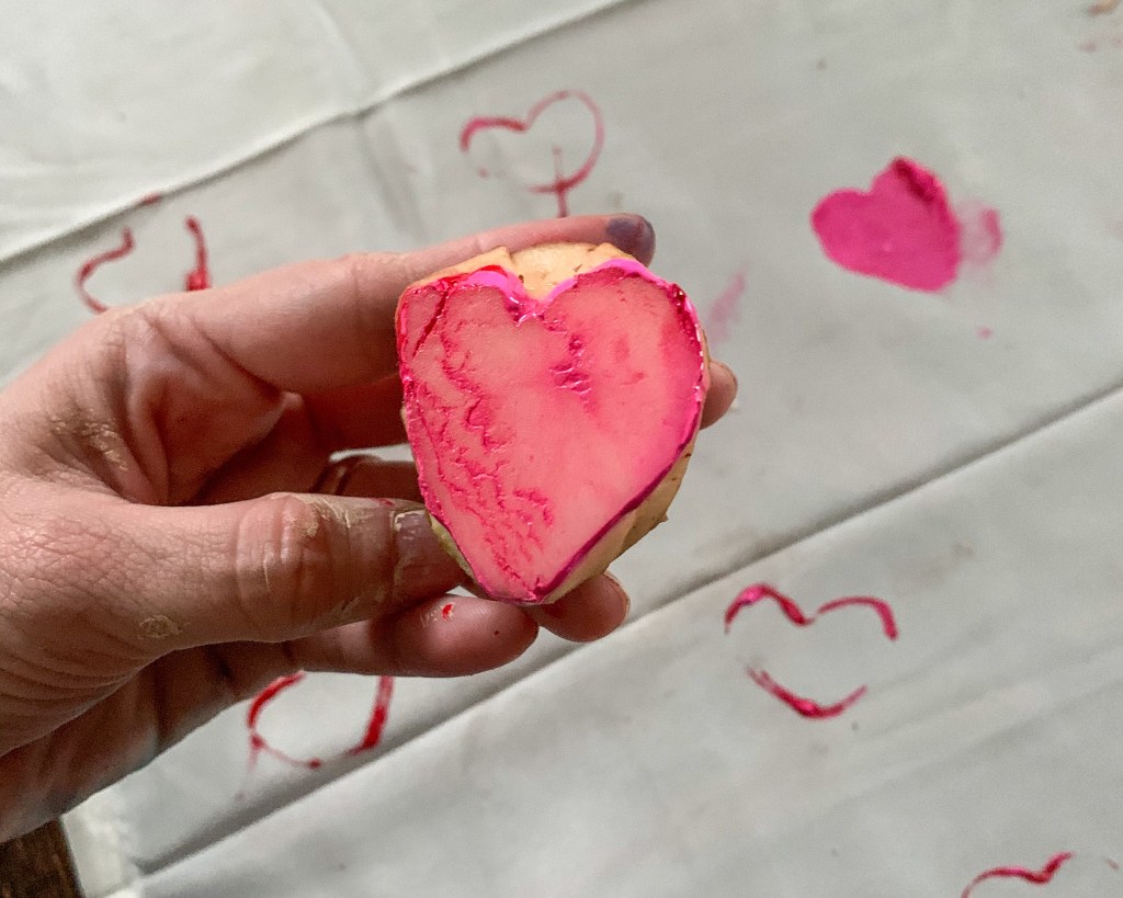 Now it’s time to prepare your stamps. For the potato stamp, carefully cut the potato in half. On the flat side, use a marker or pen to draw half of a heart shape. Then, with a sharp knife, carefully cut along the outline to create your heart-shaped stamp. You’ll have a fun, textured heart shape ready to print!