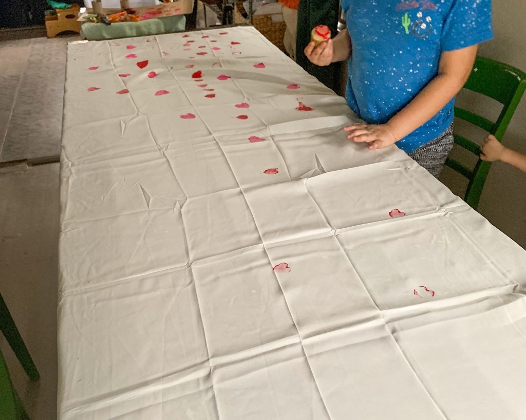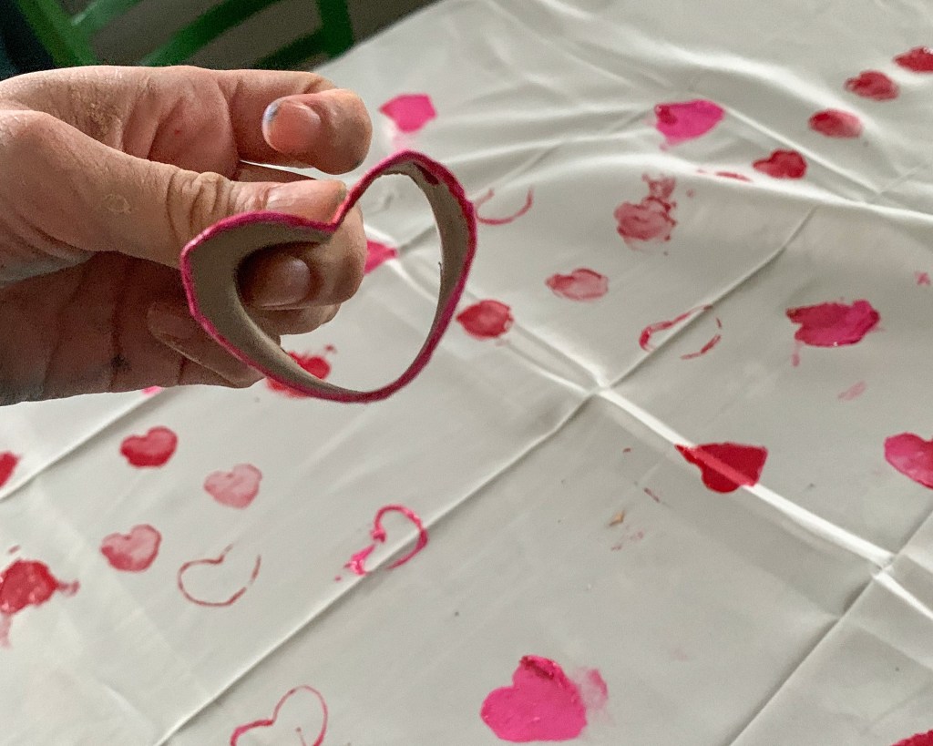 Begin stamping the potato heart onto the sheet, pressing it gently to transfer the paint evenly onto the fabric. Repeat this process, spacing your hearts out across the sheet as you go. You can mix up the size and pattern by alternating between the large potato stamp and the smaller toilet paper roll stamp.
