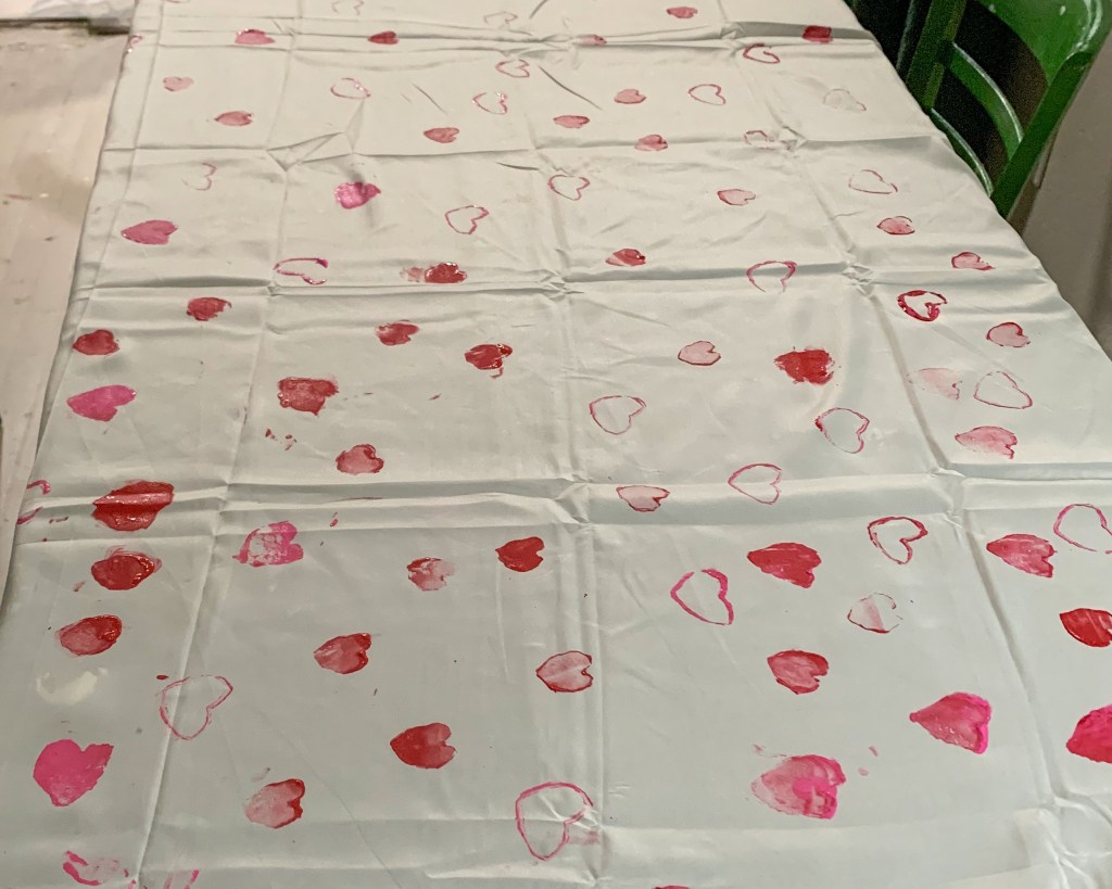 Once dry, you can now use your heart-filled sheet as a backdrop for your Valentine’s Day celebration! Whether you keep it on the table as a charming tablecloth or hang it on the wall for photos, this backdrop will bring a fun, festive vibe to any space.