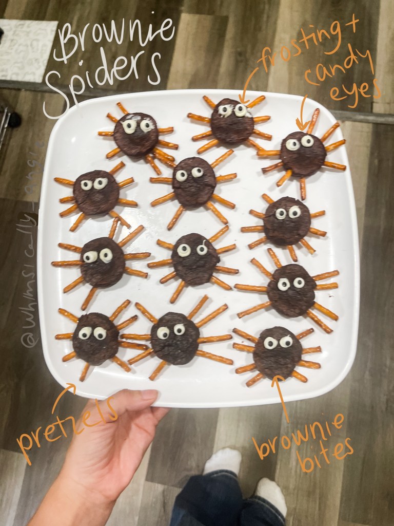 made with pre made brownies, pretzel sticks broken in half, candy eyes, and a bit of frosting to hold the eyes in place