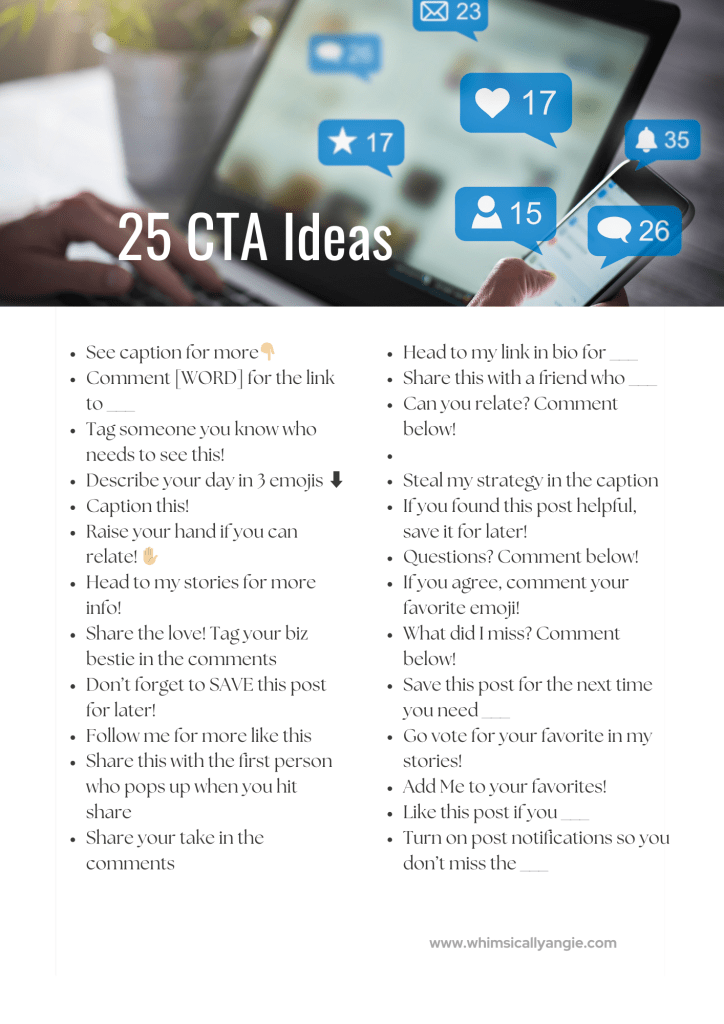 Posted in Content Creation CTA ideas for Creative Content Creators Posted on September 16, 2024September 16, 2024 by Whimsically Angie Share this: Click to share on Facebook (Opens in new window) Facebook Click to share on Pinterest (Opens in new window) Pinterest Like Loading... Author: Whimsically Angie Creative Content Creator & mom of 4 View All Posts