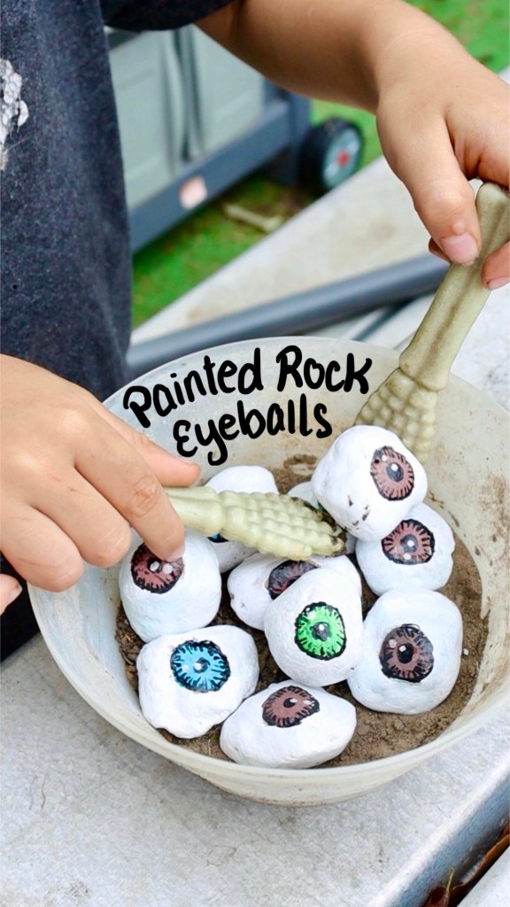 Gather smooth rocks and use acrylic paint to create spooky eyeballs for those witch’s brews. Once painted, you can use them in play kitchens, place them in your garden, on your porch, or even inside as unique table decor.