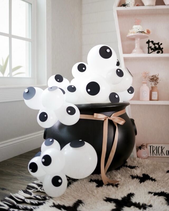 Along the same line, you can create a spooky cauldron filled with DIY eyeballs using balloons and paper for a perfect Halloween centerpiece! Inflate small white balloons to serve as the eyeballs, then add simple paper irises and pupils. Place them in a black cauldron to create a fun party display.