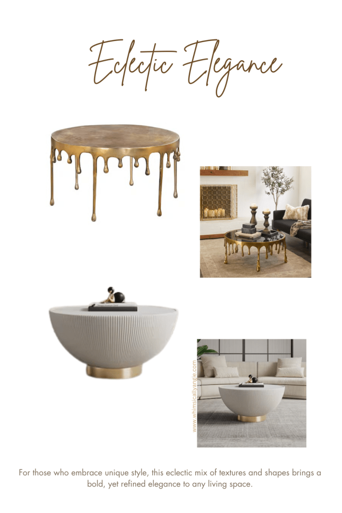 Eclectic Elegance is all about celebrating playful shapes, bold textures, and unexpected combinations that add character to any space. This style encourages mixing diverse materials—like marble, metal, and wood—while keeping a sense of balance and sophistication. Perfect for those who love to have fun with their decor while maintaining a refined, curated aesthetic.