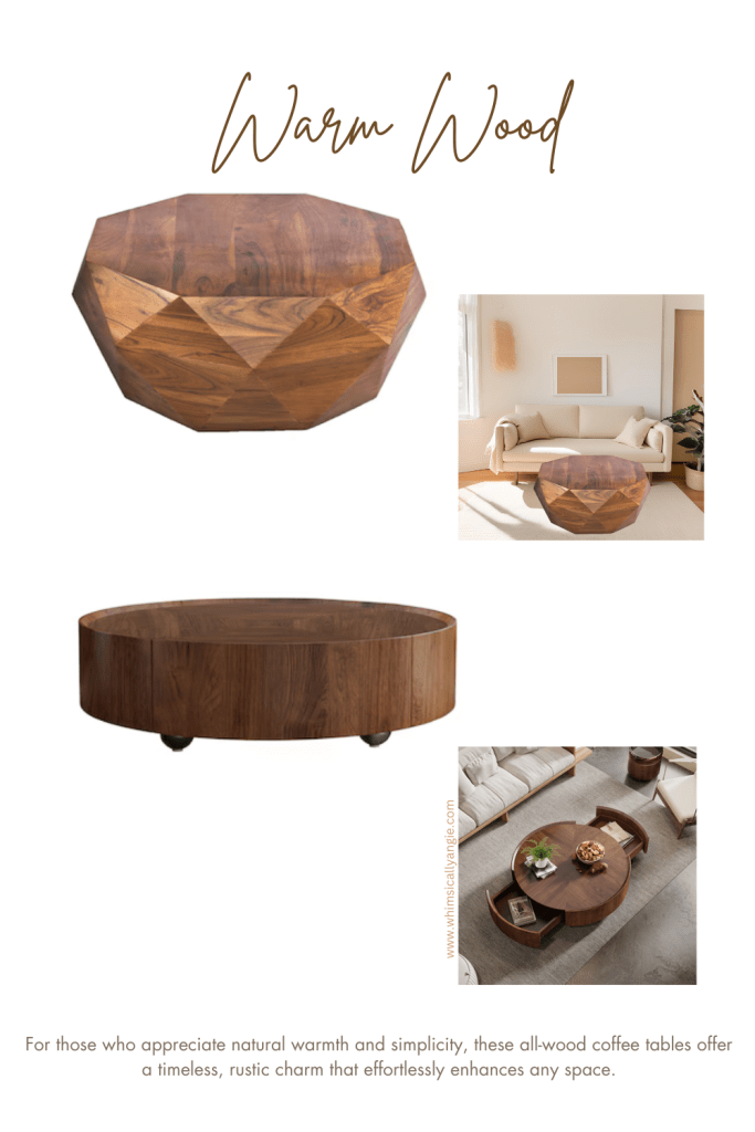 For those who appreciate natural warmth and simplicity, all-wood coffee tables bring timeless warmth and organic charm to any home. Wood adds depth and texture to your space while maintaining a sense of calm. These tables are ideal for creating a cozy, earthy atmosphere that never goes out of style.