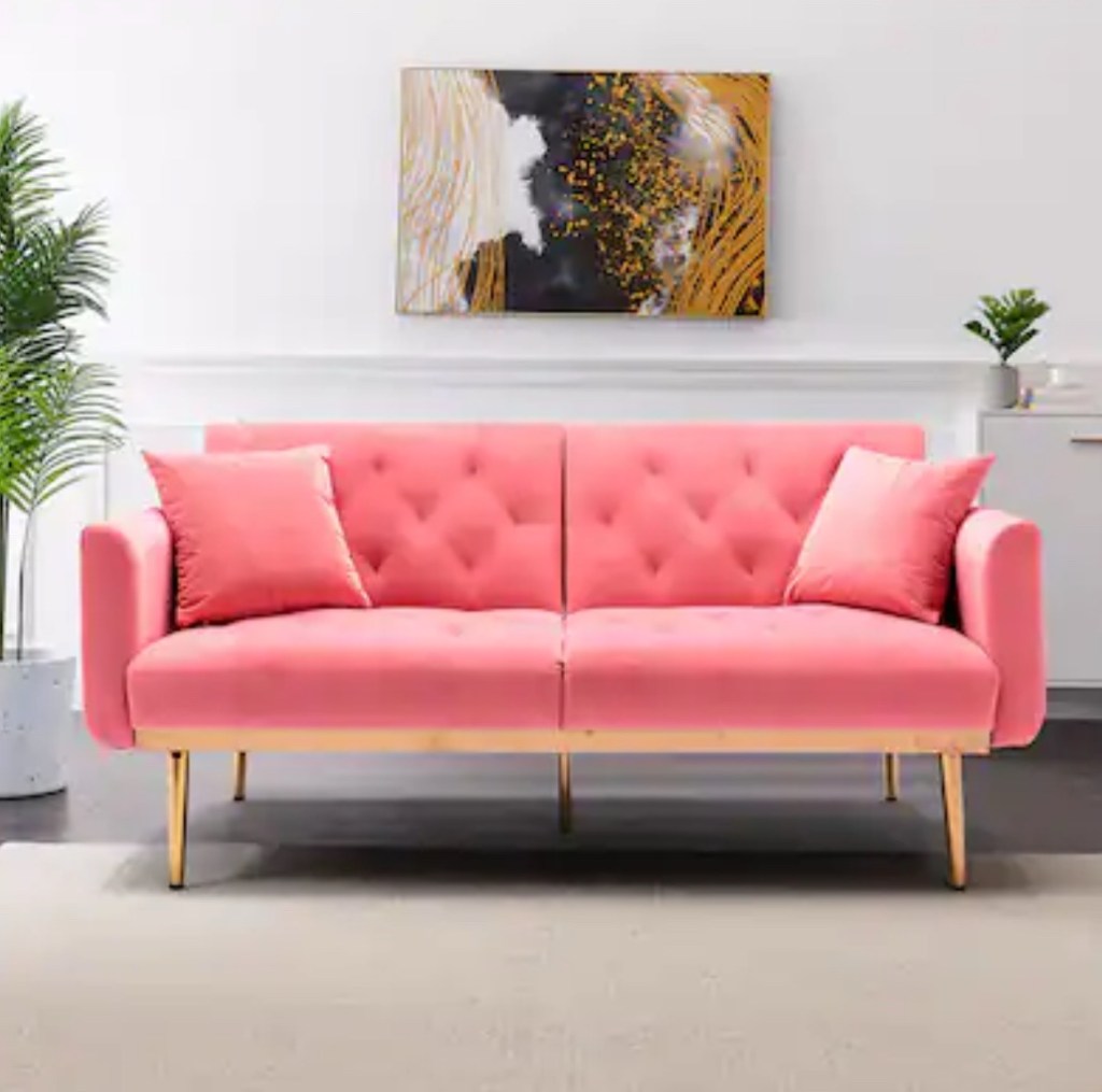 5. The Kent sofa set is the perfect mix of modern style and cozy comfort, with sleek European design and vintage-inspired tapered legs. Upholstered in soft velvet fabric and built with a sturdy wood frame, it’s got both style and support. The peach fabric adds a warm, inviting pop of color that feels soft and relaxing, instantly brightening up any room. Its subtle yet lively tone fits right in with any style, from contemporary to boho, and pairs perfectly with neutral tones. Whether you want a fresh vibe or a touch of elegance, this peach pink couch gives you the best of both worlds!