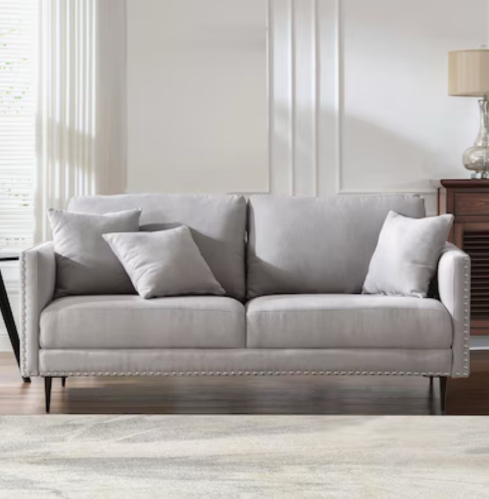 4. This 72″ modern sofa is all about comfort and style, with thick cushioning, high-density foam, and a web suspension system for support that lasts. Its sleek metal legs and nailhead trim add a classy touch to any room. A gray couch is a versatile choice because it provides a neutral foundation that complements virtually any decor style. Its timeless appeal ensures it won’t go out of fashion, making it a lasting investment for your home. Gray also offers practicality, as it hides stains and wear better than lighter colors, making it ideal for families or high-traffic areas.