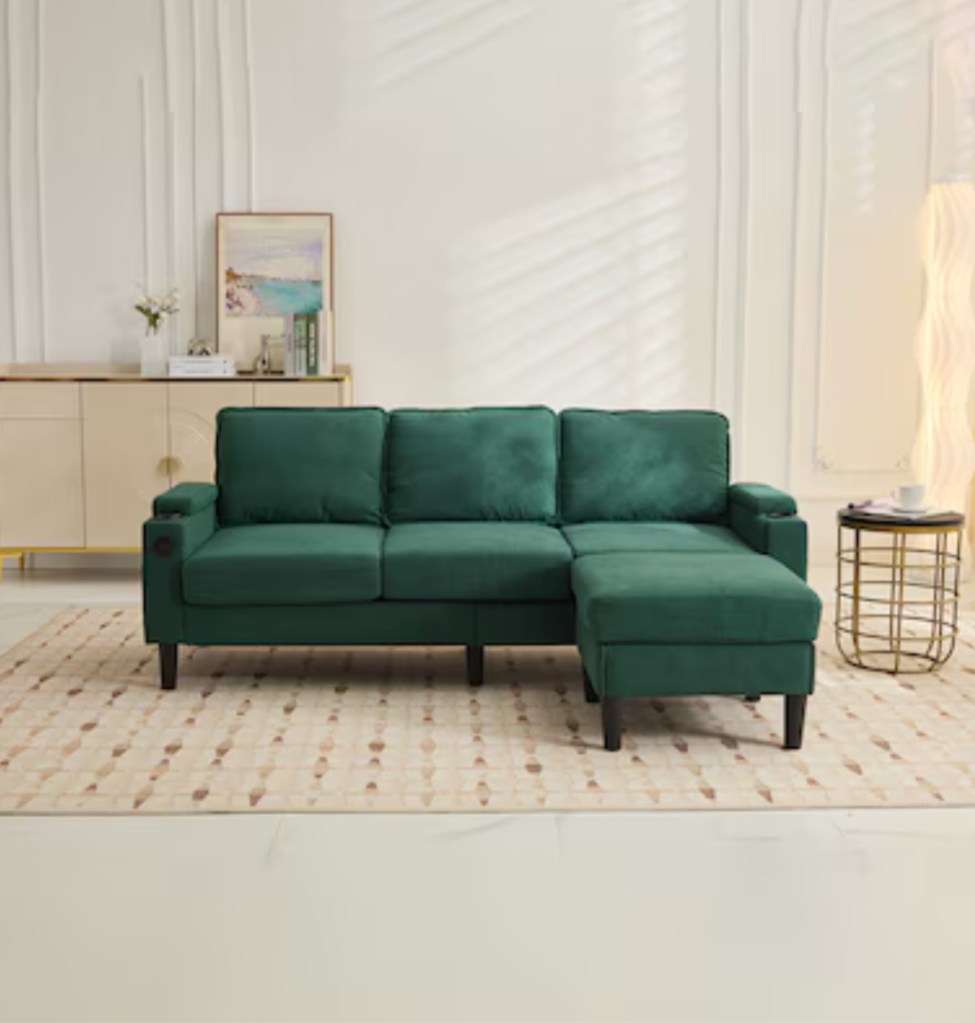 3. This sectional sofa is as comfy as it is practical! Made with soft, durable linen fabric that’s easy to clean, it’s perfect for homes with kids or pets. The sturdy wood frame supports up to 600lbs, while the S-shaped springs keep things comfy for the long haul. The versatile ottoman doubles as a coffee table and offers handy storage, plus it’s got a USB port and cup holder for extra convenience. Easy to assemble in just 15 minutes, it fits perfectly in living rooms, apartments, or offices. And with its calming green color, this sofa brings a fresh, peaceful vibe to any space, matching effortlessly with both bold and neutral tones!
