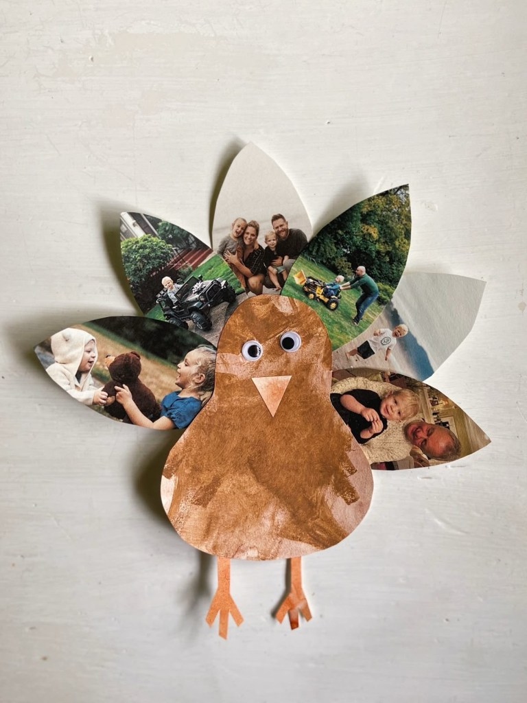 Another fun idea is to turn your thankful turkey into something even more memorable by swapping paper feathers for printed photos. Use pictures of family, pets, favorite places, or the everyday moments you actually want to glue to your heart (and your craft table).