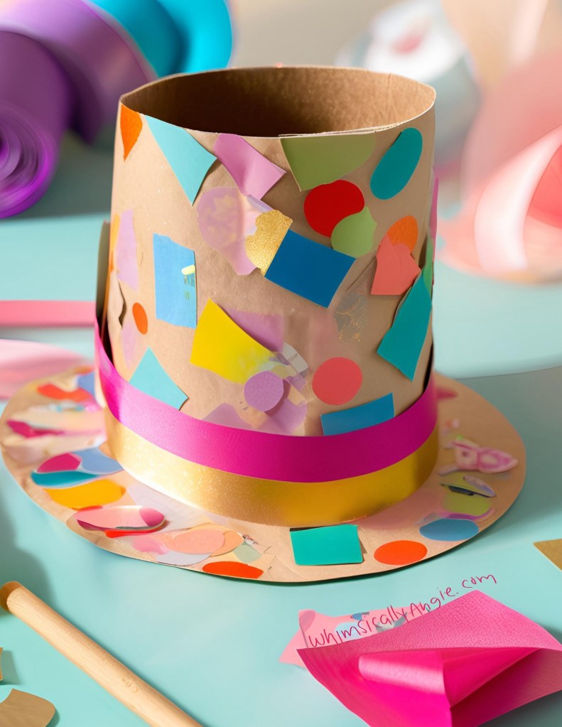 - Wrap with Paper: Once the structure is in place, take the colorful construction paper and cut it to size. Wrap it around both the top and bottom of the rolls, covering the entire surface. Secure it with glue or tape. If you’re using black paper, this will give your hat a classic top-hat look!